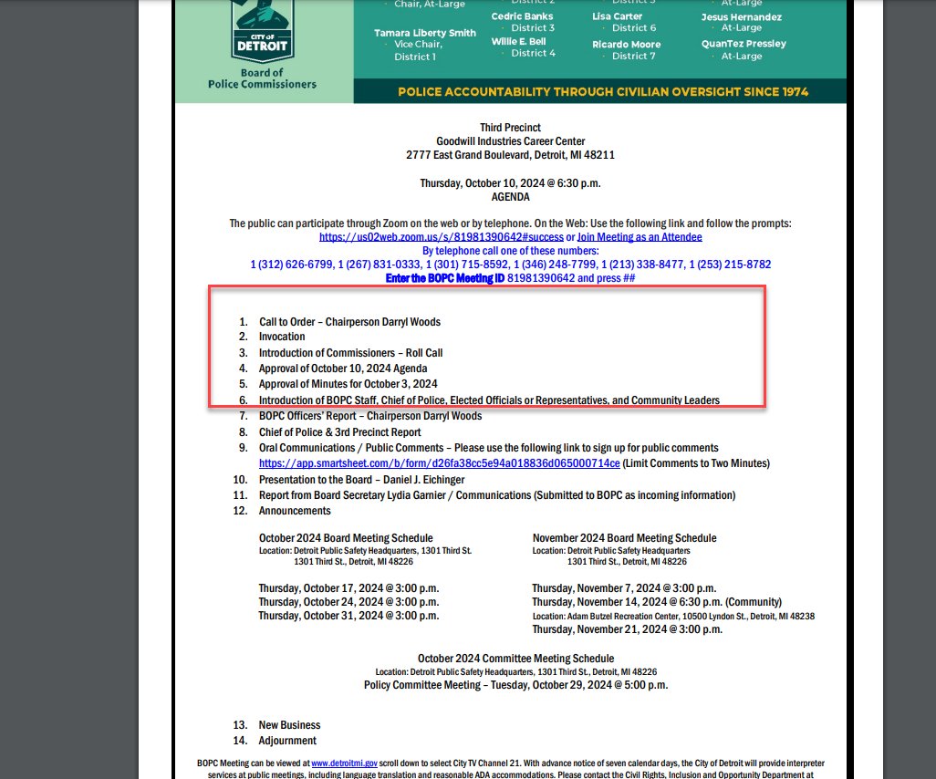The Board of Police Commissioners has supervisory control and oversight of the Police Department, including plenary authority over citizen complaints and the power to appoint fact finders, subpoena witnesses, administer oaths, take testimony, and require the production of evidence. The Board also appoints a civilian as Director of Police Personnel and approves all promotions made by the Chief. The 11 member board is comprised of 7 elected members from each city council district and 4 members appointed by the Mayor. https://detroitmi.gov/government/boards/board-police-commissioners